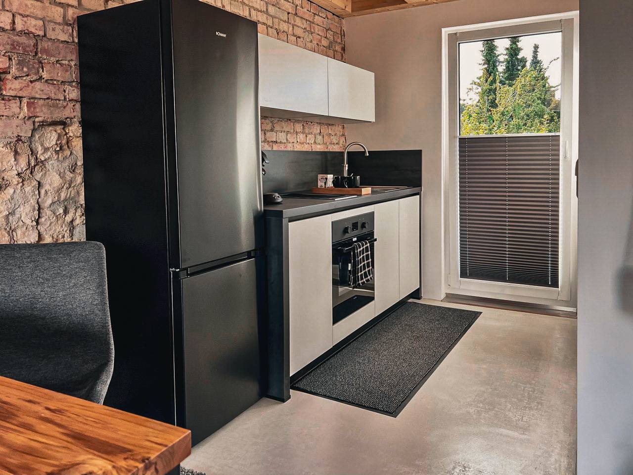 Sie verfügt über einen eigenen Eingang und direkten Zugang zur voll ausgestatteten Küche mit großem Stehkühlschrank und Gefrierschrank, sowie einem herrlichen Blick auf die Hühnerwiese.
